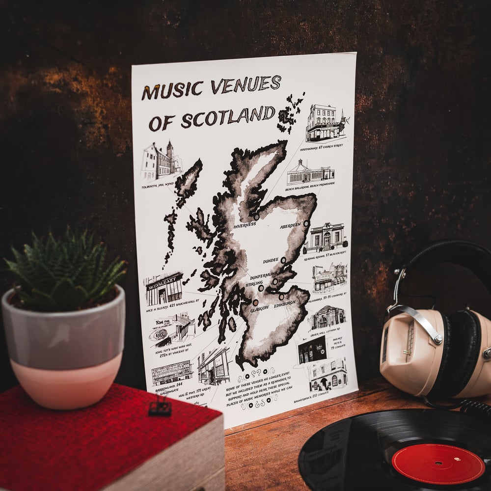 Beautiful A3 map print featuring a selection of Scotland's independent music venues of past and present. Digitally printed onto smooth cardstock with eye catching silver foil detailing, each print comes packaged in a board back envelope for care in transit.