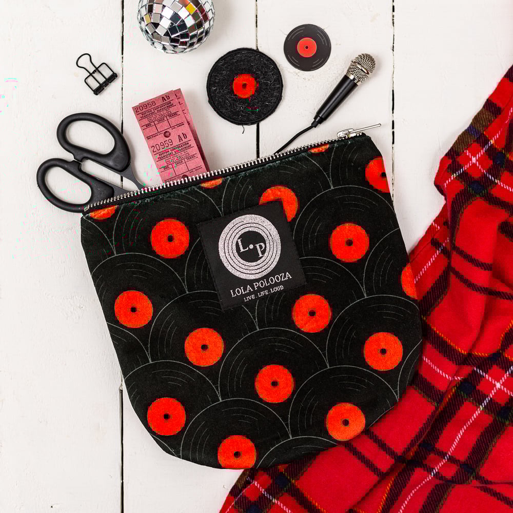 Buttery soft velvet, bold eye-catching record print, sparkly label and room for your essentials this is the perfect pouch for every music fan.